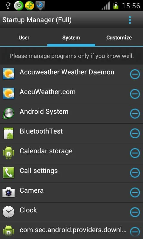 මේ App එකට ගිහින් "User" Tab එක යටතේ මේ විදියට Open වෙන Apps දකින්න පුළුවන්. ඒ එක එකක දකුණු පැත්තට වෙන්න තියන රවුමත් එක්ක අඩු කිරීමේ ලකුණ select කිරීමෙන් අපට ඒ App එක Phone එක start වීමේදී on වීම නවත්වන්න පුළුවන්.